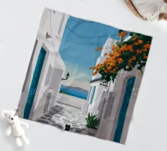 Guardando su per una stretta scala arancione e assolata verso una scheggia di cielo blu intenso e una porta, si crea una scena di viaggio calda, invitante e pittoresca.