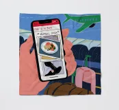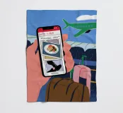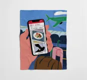 Un'illustrazione che mostra una mano che tiene in mano uno smartphone, scegliendo tra le destinazioni di volo online. L'immagine cattura l'eccitazione moderna e la possibilità di pianificare un viaggio in un mondo digitale.