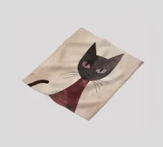 Illustrazione minimalista in bianco e nero di un elegante gatto nero con occhi esageratamente grandi e lineamenti abbozzati. Il disegno astratto e stravagante del gatto aggiunge un tocco artistico e giocoso.