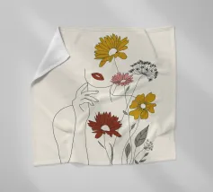 Un disegno al tratto minimalista raffigura un volto sereno intrecciato con un grande fiore arancione e foglie verdi. L'uso di linee semplici e di tonalità della terra crea una composizione elegante e rilassante.
