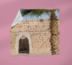 Ombra di una palma botanica su un muro color pastello a Rabat. Fotografia di strada in Marocco. Antico muro di cinta nella capitale Rabat.