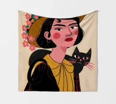 Una persona che indossa un vivace top arancione tiene vicino un elegante gatto nero, i loro sguardi sono allineati, evidenziando il forte legame tra l'uomo e l'animale domestico su uno sfondo semplice e dai toni caldi.