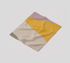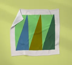 Domina uno stile minimalista con ampie fasce di colore blu, verde e viola, separate da linee rette per creare una composizione segmentata. L'elemento centrale ricorda un paesaggio stilizzato con un primo piano, un orizzonte e un cielo semplificati.