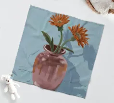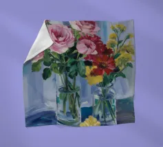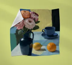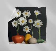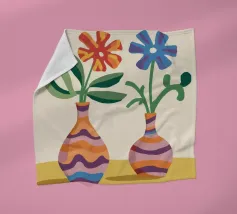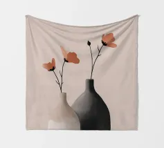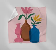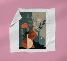 Elegante poster di natura morta con vasi in ceramica dai toni pastello riempiti di fiori sbocciati rosa e arancioni, su un morbido sfondo blu. Perfetto per aggiungere un tocco artistico e sereno agli interni moderni. Ideale per gli amanti dell'arte e dell'arredamento in cerca di ispirazione floreale.