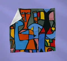 Due figure stilizzate dominano la composizione, caratterizzate da forme astratte e colori vivaci. Una figura appare di profilo mentre l'altra è rivolta in avanti, entrambe con tratti esagerati e una qualità stravagante.
