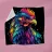 Un'impressionante rappresentazione di un gallo che prende vita in un'esplosione di colori vivaci. L'illustrazione mostra la testa dell'animale di profilo frontale, con piume dettagliate nei vibranti colori dell'arcobaleno. Lo sfondo è di un nero profondo che rende la varietà dei colori particolarmente intensa. Le sfumature a goccia alle estremità delle piume rafforzano l'impressione di dinamicità. Questa potente composizione combina una rappresentazione della natura con un'estetica artistica moderna ed espressiva.