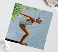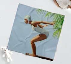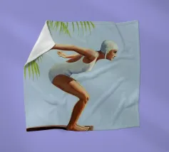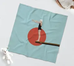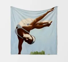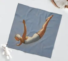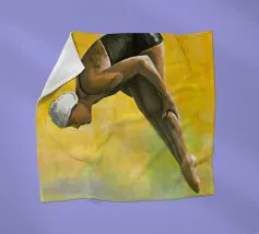 Un'illustrazione dinamica, in stile fumetto, che cattura una nuotatrice al rallentatore mentre inizia a saltare dal bordo della piscina. Con linee decise e pennellate disinvolte, la scena fonde energia ed eleganza, congelando il momento del volo in uno sprazzo di colore e movimento espressivo.