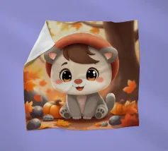 Un affascinante orso dai lineamenti rotondi riposa tra vivaci foglie autunnali e piccole zucche. I colori caldi creano un'atmosfera accogliente nella tranquilla foresta.