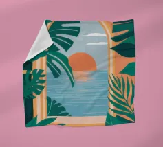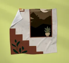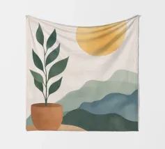 Una composizione minimalista presenta un vaso con una pianta verde davanti a una finestra ad arco, che mostra un paesaggio sereno con montagne, sole e lago in toni tenui. Le calde tonalità del marrone e del rosa creano un'atmosfera naturale e rilassante.