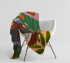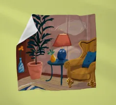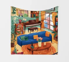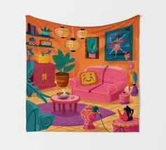 Un'illustrazione vivace di un soggiorno eclettico e massimalista con mobili colorati, una parete a galleria, numerose piante d'appartamento e un tappeto viola.