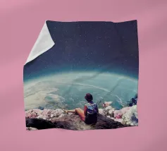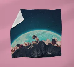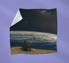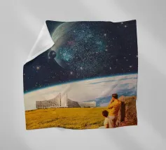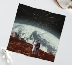 Vivevamo lì. Ricordate? Quel mondo ci sta ancora aspettando. ~ Coppia seduta su una panchina che guarda la Terra surreale retro futuristico stellato composizione romantica. versione orizzontale