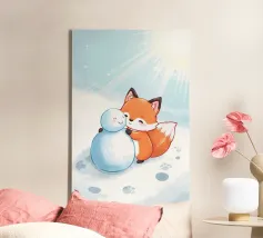 La volpe Voxy abbraccia dolcemente il suo piccolo amico di neve sotto il sole invernale. Colori tenui, impronte giocose e un'accogliente scena innevata rendono quest'opera d'arte perfetta per le camerette dei bambini, le nursery e gli amanti dell'arredamento invernale. Un'illustrazione che fa sciogliere il cuore, piena di amicizia e calore.