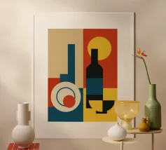 Un'audace composizione astratta con forme geometriche nei toni del rosso, del verde acqua, del grigio e del beige. Il design è semplice e moderno e mette in risalto il contrasto di colori.