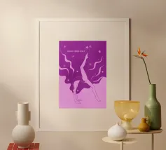 Questo disegno mostra una donna dai capelli viola che si sdraia con disinvoltura su una poltrona giallo senape: rilassata, sicura di sé, completamente immersa nel momento. Il contrasto tra lo sfondo scuro, il pavimento rosa e la poltrona di velluto giallo crea un linguaggio visivo potente e moderno dal fascino retrò.