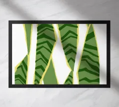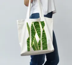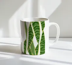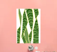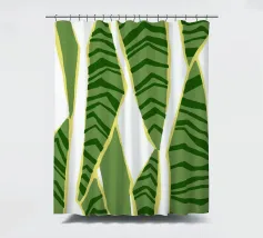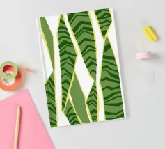 I motivi geometrici astratti a strisce verdi e gialle creano un senso di movimento nella composizione. Il disegno presenta elementi verticali di forma irregolare che suggeriscono un tema naturale.