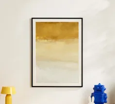 Un'opera d'arte astratta minimalista in campo cromatico ispirata a transizioni morbide e bordi grezzi del pennello.