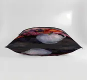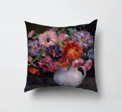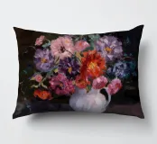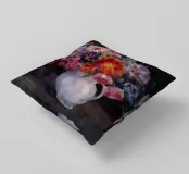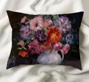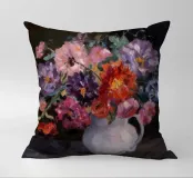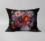 Una brocca bianca contiene un abbondante e traboccante bouquet di fiori in un tripudio di colori rosa, viola, rossi e gialli, dipinti in uno stile ricco, scuro e lunatico che sembra al tempo stesso classico ed espressivo.