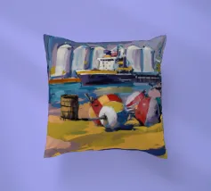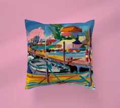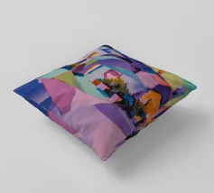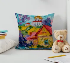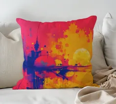 Quadro astratto dinamico che presenta un'architettura surreale, vivaci toni arancioni e blu, alberi astratti e sfere fluttuanti in un paesaggio fantastico. I tratti strutturati e i contrasti decisi creano un'atmosfera onirica ed energica.