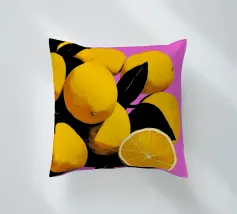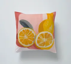 Una natura morta mediterranea con limoni e foglie verdi in tenui colori pastello è presentata in un motivo grafico a quadri. Questa illustrazione di ispirazione vintage dona un tocco di estate tropicale a qualsiasi cucina e celebra la freschezza di frutta e verdura biologica.