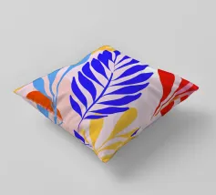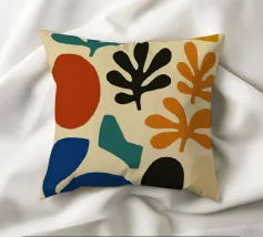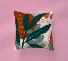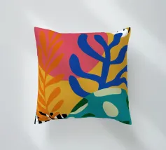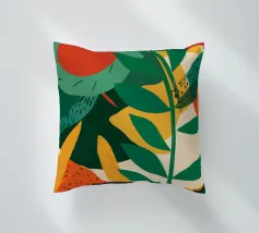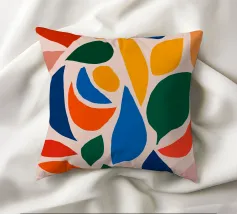 Un'audace composizione astratta presenta forme organiche in vibranti tonalità di arancio, blu e verde. Una grande forma verde simile a una foglia contrasta con il caldo sfondo arancione e rosso.