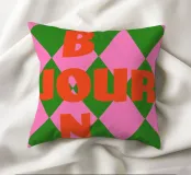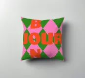 Questo motivo presenta l'allegra scritta "BON JOUR" in arancione brillante, disposta in modo dinamico su un motivo di rombi verdi su sfondo rosa. I forti contrasti di colore e la tipografia giocosa conferiscono all'immagine un aspetto fresco, energico e moderno. Ha un effetto amichevole e invitante e diffonde immediatamente il buon umore.
