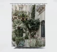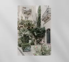 Scena di strada nell'antica città di Siracusa. Molte piante e alberi ricoprono gli antichi edifici di questa strada.
