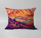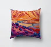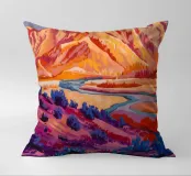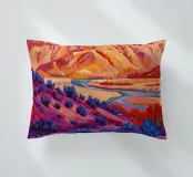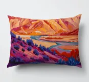 Un fiume si snoda attraverso un canyon dipinto in un prisma di colori vibranti e non naturalistici, con rossi infuocati, viola profondi e blu freddi che creano un paesaggio altamente espressivo e moderno.