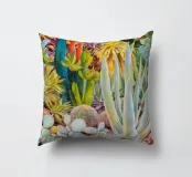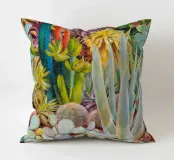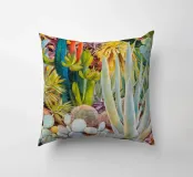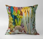 Una vista ravvicinata di un giardino nel deserto rivela una collezione caotica e bellissima di succulente e cactus, dipinti in un tripudio di colori vibranti ed espressivi che celebrano la diversità della flora del deserto.
