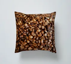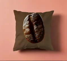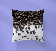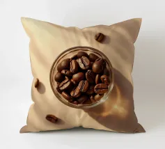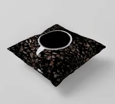 I chicchi di caffè marrone sono sospesi in aria sopra una superficie lucida che riflette una pozza scura di caffè preparato, creando un'atmosfera drammatica e accattivante.