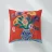Un vivace bouquet di fiori nei toni del rosso, del giallo e del blu è disposto in un classico vaso a cineserie blu e bianco. L'ambientazione comprende una tovaglia a righe e uno sfondo luminoso e caldo.