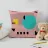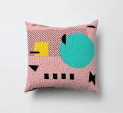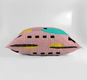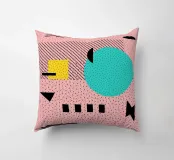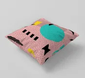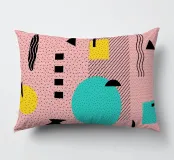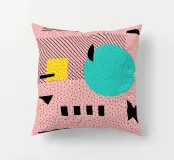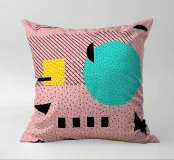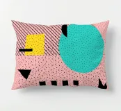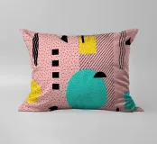 Divertente disegno geometrico di Memphis in stile retrò anni '80 con forme geometriche, cerchi, quadrati, triangoli, onde e linee in verde acqua, giallo e nero, su uno sfondo color pesca pastello.