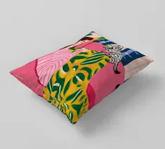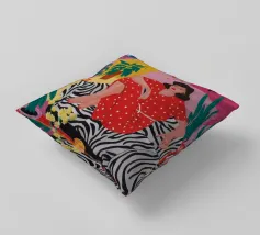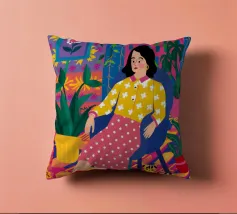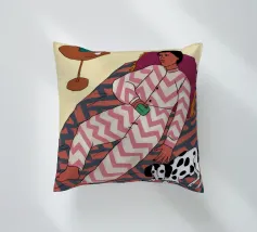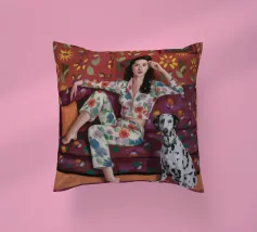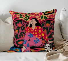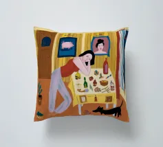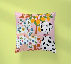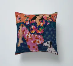 Una donna si trova in una cucina dai colori vivaci con un dalmata al suo fianco, una finestra che mostra una scena all'aperto e vari dettagli della cucina, creando un'illustrazione domestica eccentrica e affascinante.