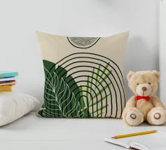 Forme geometriche astratte e linee curve creano una composizione armoniosa nei toni del verde e del nero. Un elemento botanico aggiunge un tocco organico tra le forme strutturate.