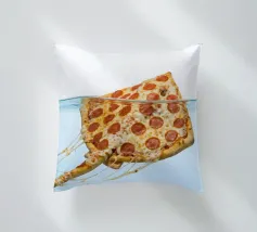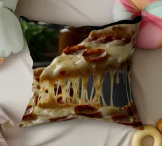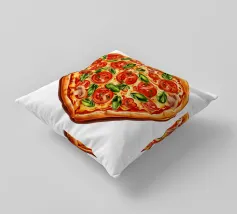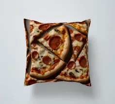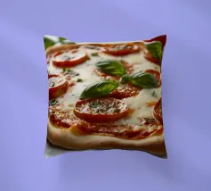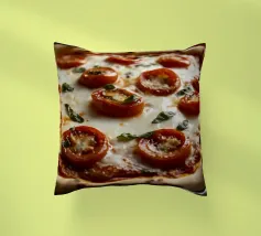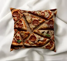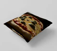 Diversi tranci di pizza sono esposti ad arte con condimenti vivaci come olive, pomodori e foglie di basilico fresco, creando un'invitante visione culinaria.