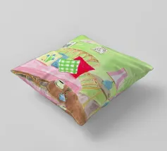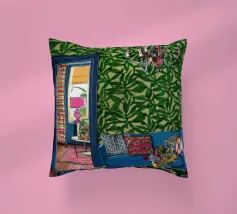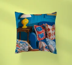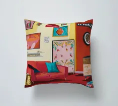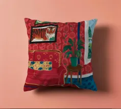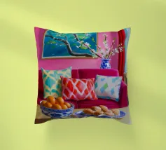Un lussuoso divano di velluto rosa si trova tra due tavolini con lampade, in una stanza con pareti rosso intenso e tende blu a fantasia. La scena è equilibrata, serena ed emana un'eleganza sofisticata e lunatica.