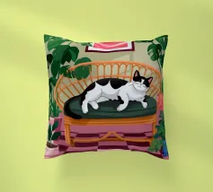 Un'illustrazione affascinante e accogliente di un gatto "smoking" bianco e nero che dorme pacificamente su un divano giallo, circondato da piante in vaso. L'opera d'arte cattura la gioia semplice e tranquilla di un pisolino.