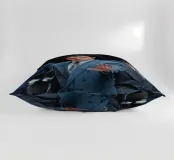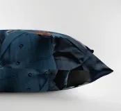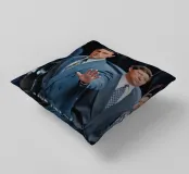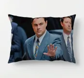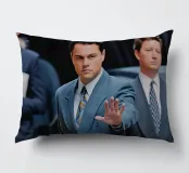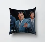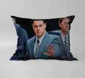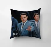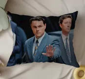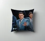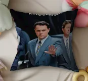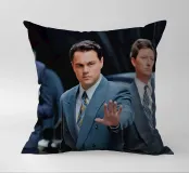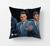 "Leonardo DiCaprio nei panni di Jordan Belfort, in un elegante completo blu, alza la mano in un gesto di 'stop' con un'espressione determinata, camminando con sicurezza tra una folla di uomini d'affari, trasmettendo ambizione e sfida",