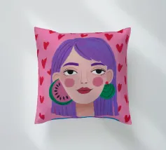 Questo dipinto raffigura una persona con i capelli neri che indossa un abito colorato con forme geometriche. Lo sfondo è rosso e la persona è adornata con grandi orecchini circolari.