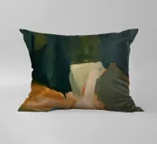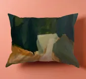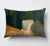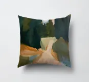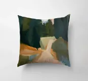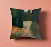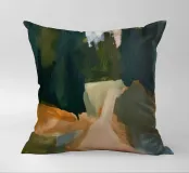 Paesaggio astratto dipinto con verdi profondi e calde tonalità della terra, che suggerisce un tranquillo sentiero nella foresta immerso in una luce soffusa.