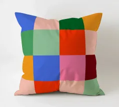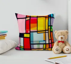 Forme geometriche dai colori vivaci sono disposte in un motivo accattivante. La composizione presenta quadrati e rettangoli di vari colori, creando un gioioso impatto visivo.