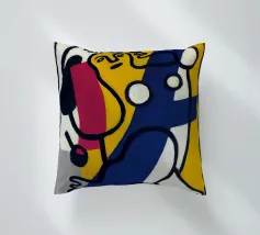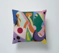Questo dipinto mostra una composizione astratta con un mix di forme geometriche e organiche. I colori sono decisi e comprendono il nero, il blu, il rosso e il bianco. Le forme si sovrappongono e creano un senso di profondità.