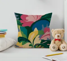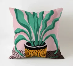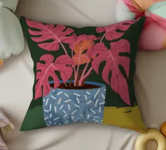 Una pianta di anthurium rosa di grande effetto si trova in un vaso variopinto e decorato su uno sfondo di un vibrante rosa caldo. La composizione è una celebrazione audace ed elegante del colore e delle piante tropicali.