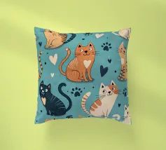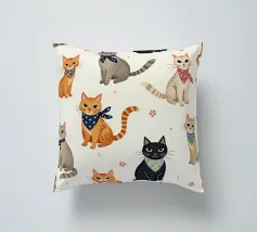 Il design stravagante presenta gatti giocosi di vari colori, ognuno dei quali indossa sciarpe uniche su uno sfondo chiaro. La vivace composizione mette in mostra creatività e fascino.