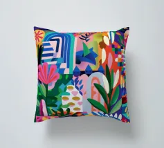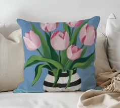 Un gatto bianco e nero siede regalmente dietro un grande vaso di fiori con motivi a strisce vivaci, sullo sfondo di una tenda rosa, creando una natura morta suggestiva e affascinante.