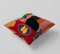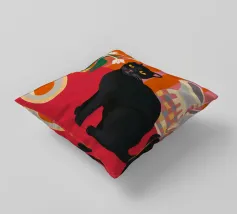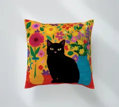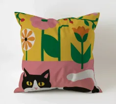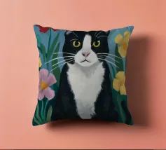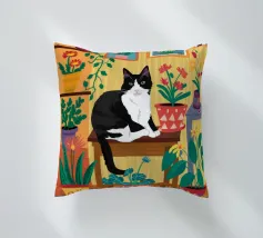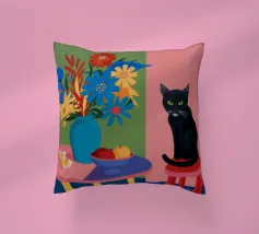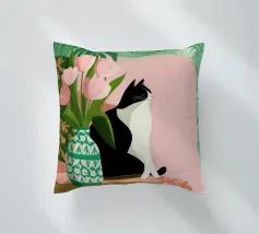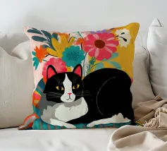 Un gatto bianco e nero siede regalmente dietro un grande vaso di fiori con motivi a strisce vivaci, sullo sfondo di una tenda rosa, creando una natura morta suggestiva e affascinante.