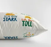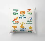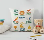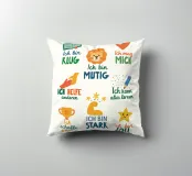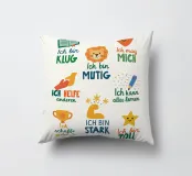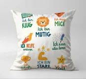 Un motivo allegro e adatto ai bambini, ricco di affermazioni positive: "Sono intelligente", "Sono coraggioso", "Mi piaccio". Le illustrazioni colorate con un cuore, una stella e un leone rafforzano la fiducia in se stessi e il buon umore. Perfetto per le camere dei bambini, gli asili nido o le aule studio, questo disegno è un promemoria quotidiano per credere in se stessi. Un mix di motivazione, colore e ottimismo per cuori grandi e piccoli.