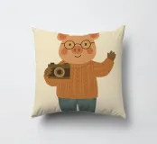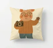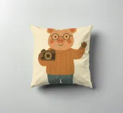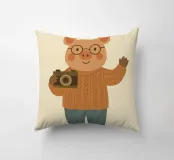 Aggiungete un tocco morbido e caldo al vostro arredamento con questo poster che raffigura un simpatico maialino occhialuto con un maglione arancione che tiene in mano una macchina fotografica.