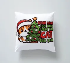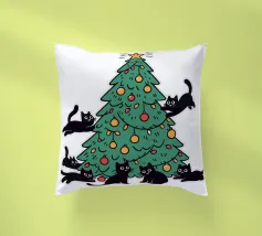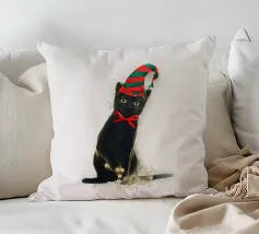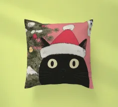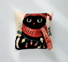Un gatto nero che indossa un cappello da Babbo Natale è spiritosamente impigliato in luci natalizie colorate. Il testo accanto al gatto recita: "È abbastanza allegro?".