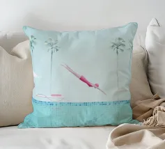 Donna che fotografa un uomo in procinto di saltare in piscina. Cielo aura sfumato e citazione 'Non è così profondo'. Surreale design retrò con piscina di motel vintage di MsGonzalez