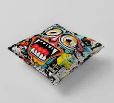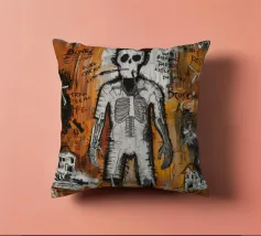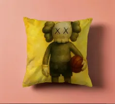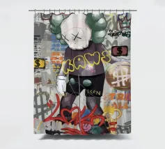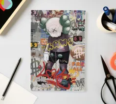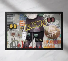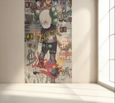 L'immagine raffigura un personaggio in stile KAWS in piedi su uno sfondo di graffiti. Il personaggio ha una testa a forma di teschio con delle "X" al posto degli occhi e indossa una maglietta scura con la scritta "KAWS" in giallo. Lo sfondo è pieno di vari elementi di graffiti, tra cui segni di dollari, corone e frammenti di testo come "LOVE", "FASHION" e "STREET ART".